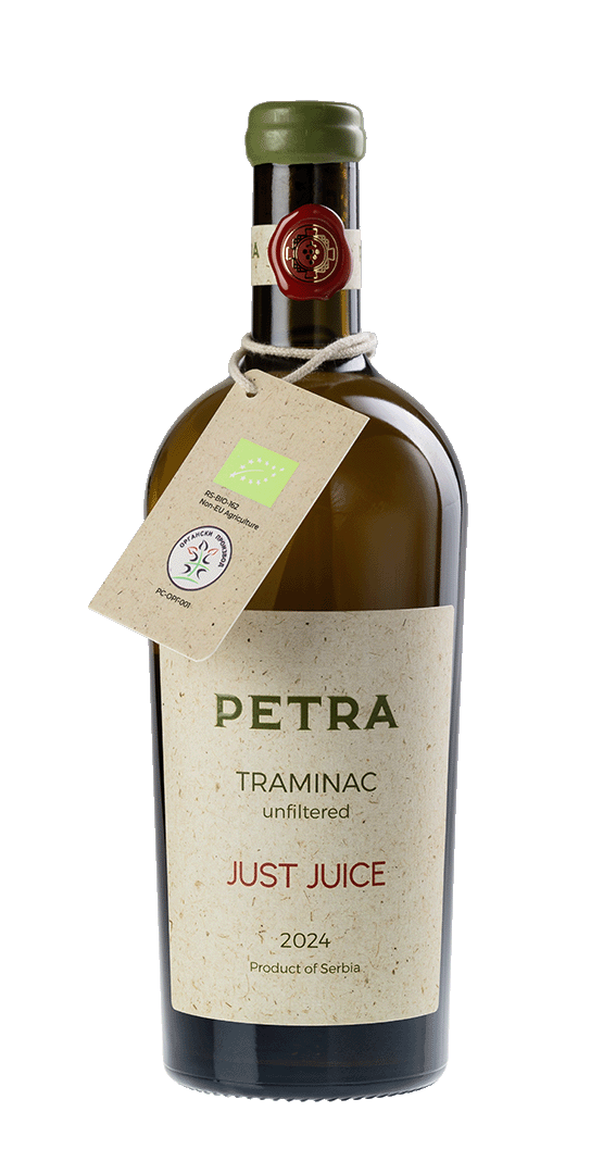 Petra Traminer Organica captures with its golden-yellow colour and mild cloudiness, as a result of excluding wine filtering. That model of approach conserves the fullness of the taste and aroma complexity, enabling each glass to tell a story of a land, variety and winemakers’ effort.